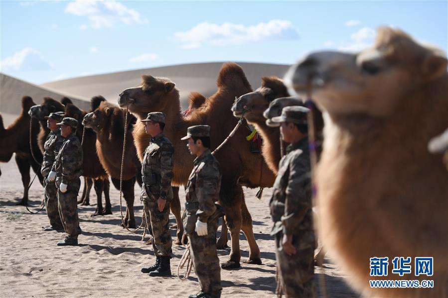 10月15日,阿拉善右旗边防民兵驼兵排民兵进行骆驼应用训练。 当日,阿拉善右旗边防民兵驼兵排联合阿拉善边境管理支队民警和当地牧民,在位于内蒙古阿拉善右旗的巴丹吉林沙漠北部进行骆驼应用训练演练,实地检验了当地民兵和民警在沙漠腹地执行巡护任务的能力。 新华社记者 任军川 摄