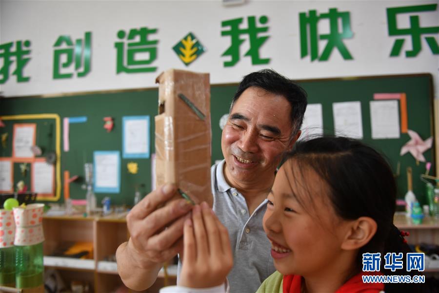 10月14日,李学战(左)通过自己设计的“迷你潜望镜”给学生讲解光学反射原理。新华社记者 胡晨欢 摄