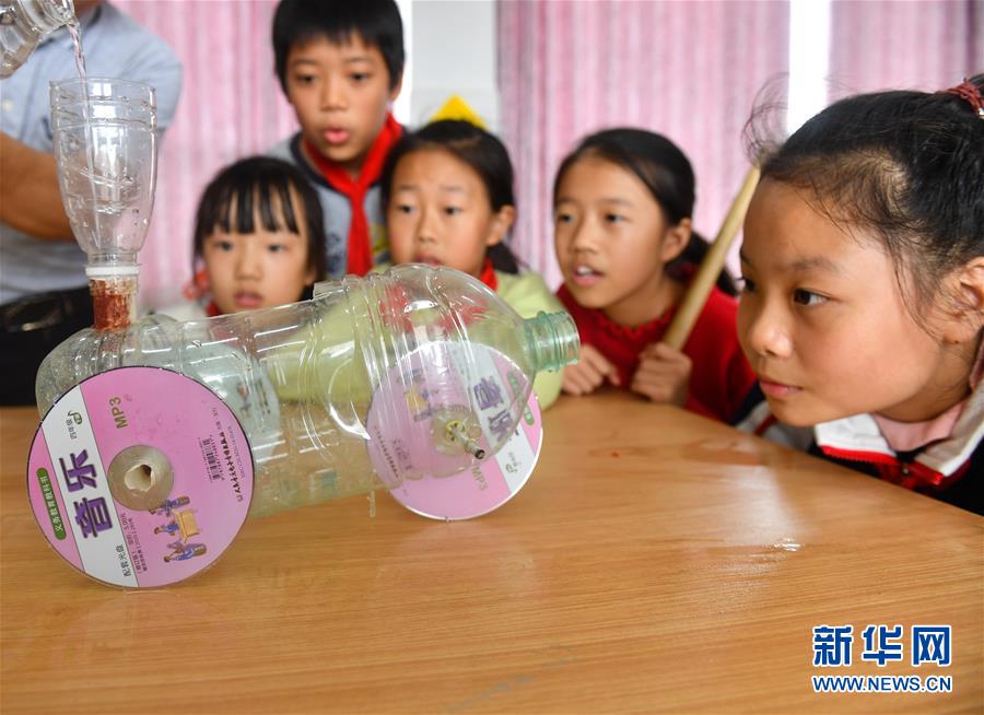 10月14日,学生们通过李学战设计的“迷你注水汽车”了解齿轮原理。新华社记者 胡晨欢 摄
