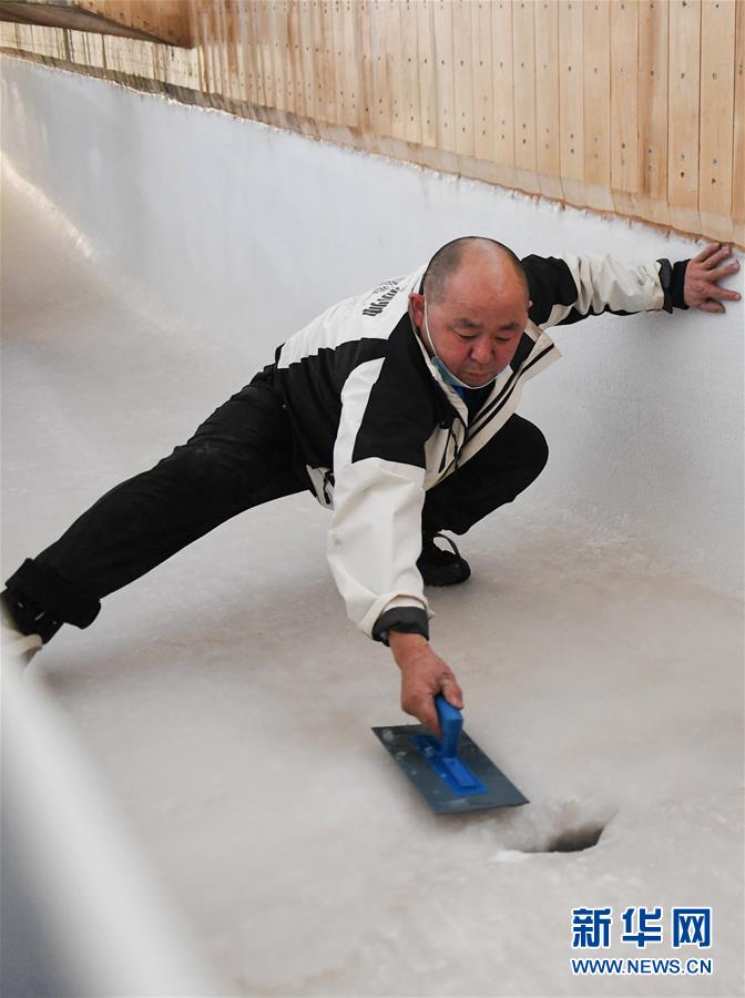 中国制冰师李开顺在赛道上进行施工作业(10月18日摄)。 新华社记者 张晨霖 摄
