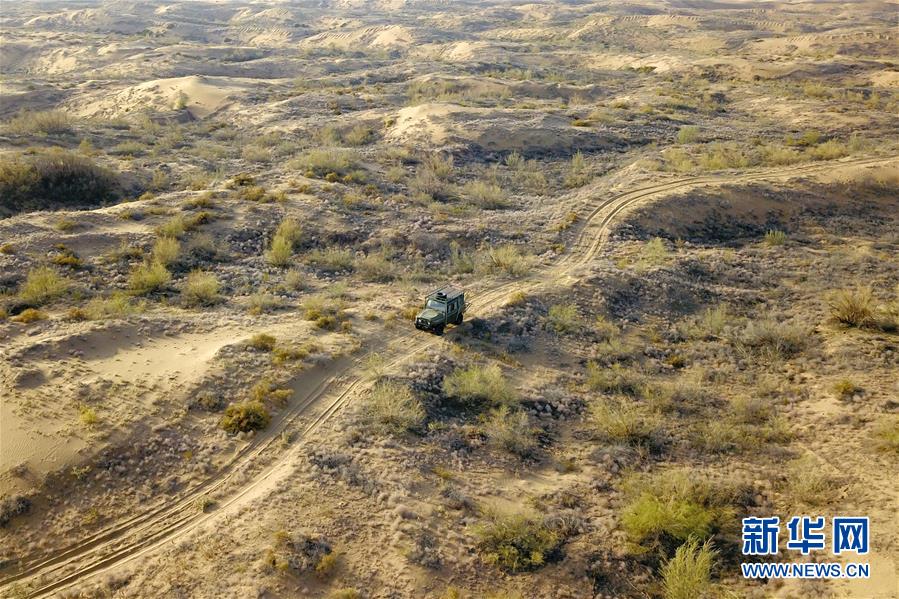 在武威市凉州区长城镇红水村,王天昌乘坐儿子王银吉驾驶的治沙车前往林区浇水(10月23日摄,无人机照片)。 新华社记者 范培珅 摄