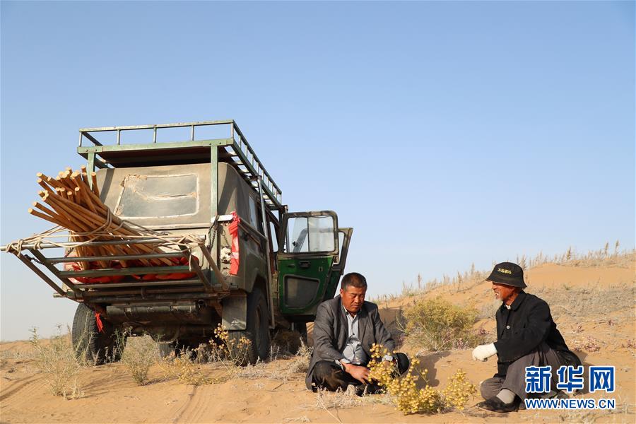 在武威市凉州区长城镇红水村,王天昌(右)和儿子王银吉在林区休息聊天(10月23日摄)。 新华社记者 马希平 摄