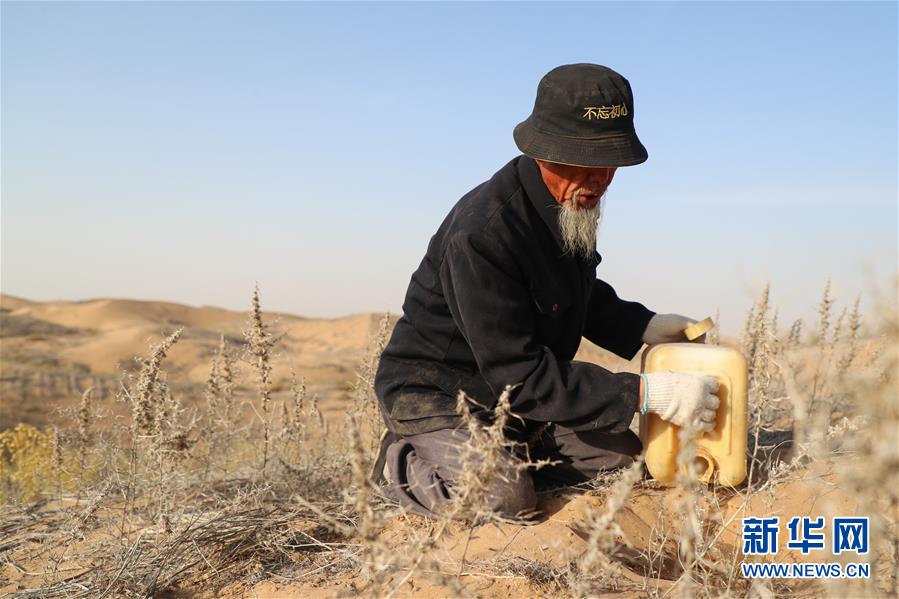 在武威市凉州区长城镇红水村,王天昌给梭梭苗浇水(10月23日摄)。 新华社记者 马希平 摄