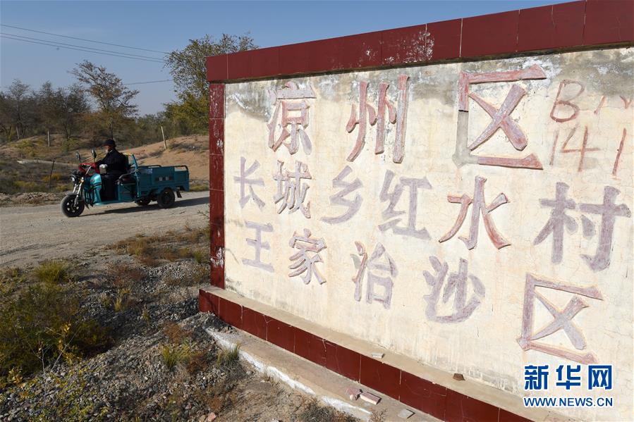 在武威市凉州区长城镇红水村,王天昌骑三轮车前往林区巡护(10月23日摄)。 新华社记者 马希平 摄