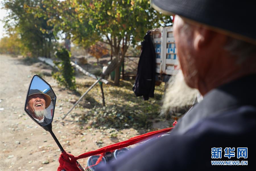 在武威市凉州区长城镇红水村,王天昌骑三轮车前往林区巡护(10月23日摄)。 新华社记者 范培珅 摄