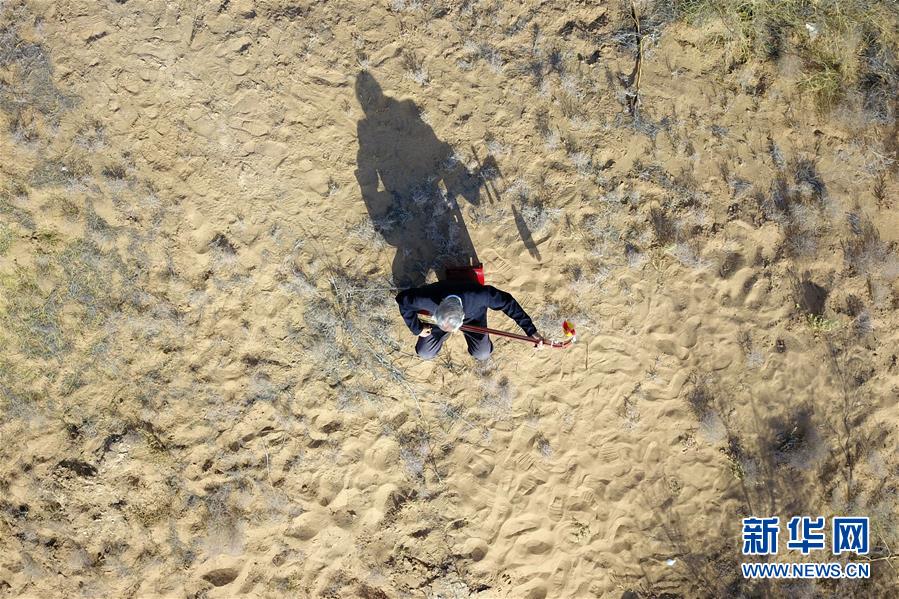 在武威市凉州区长城镇红水村,王天昌坐在林区弹三弦(10月23日摄,无人机照片)。 新华社记者 范培珅 摄