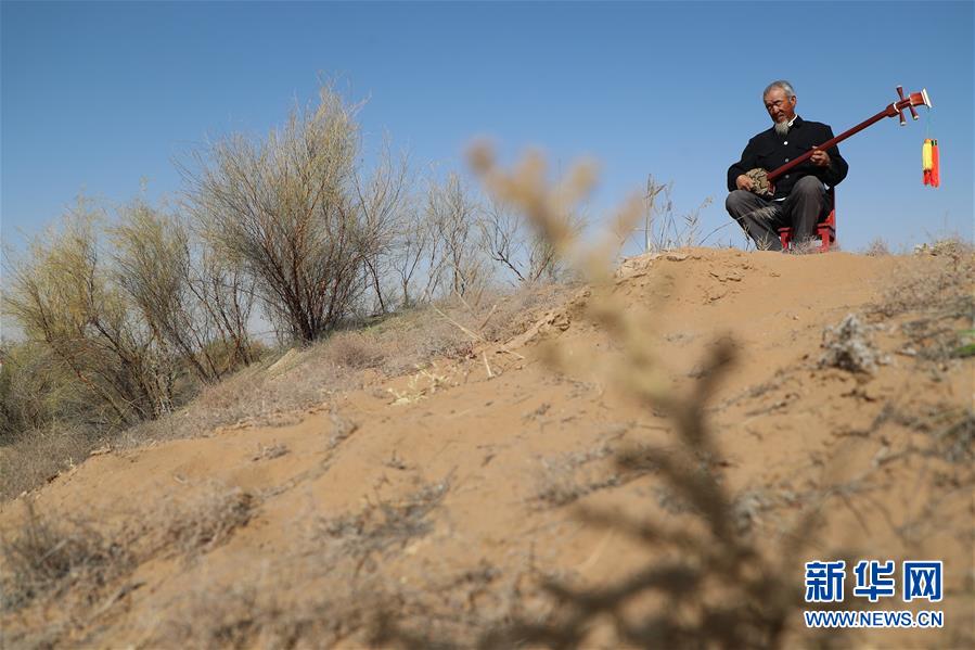 在武威市凉州区长城镇红水村,王天昌坐在林区弹三弦(10月23日摄)。 新华社记者 马希平 摄