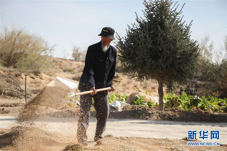 在武威市凉州区长城镇红水村,王天昌在晾晒花棒种子(10月23日摄)。 新华社记者 马希平 摄