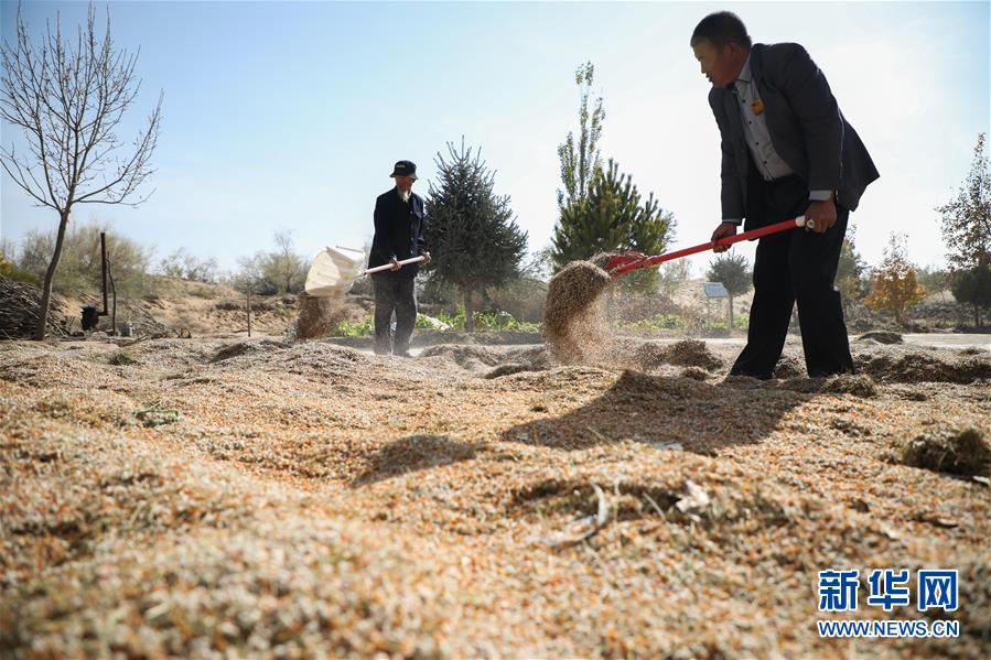 在武威市凉州区长城镇红水村,王天昌(左)和儿子王银吉晾晒花棒种子(10月23日摄)。 新华社记者 马希平 摄