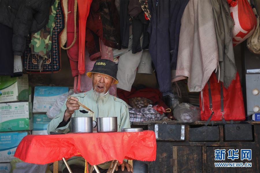 在武威市凉州区长城镇红水村治沙住地,王天昌吃午饭(10月23日摄)。 新华社记者 马希平 摄