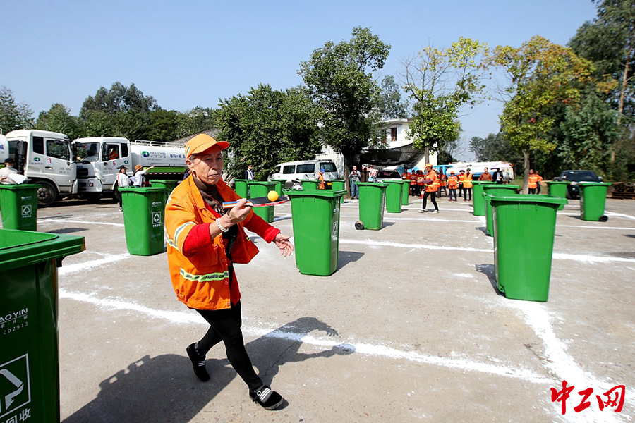 10月25日,江西省吉安市峡江县的环卫工人参加趣味“托乒乓球快走”互动游戏。(来源:视觉中国)