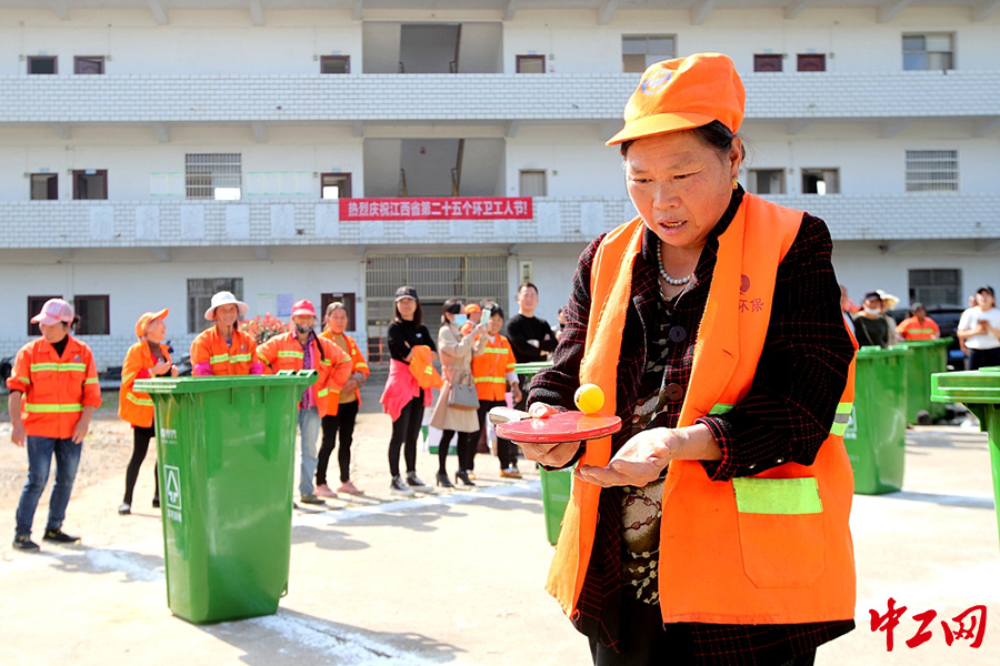 10月25日,江西省吉安市峡江县的环卫工人参加趣味“托乒乓球快走”互动游戏。(来源:视觉中国)