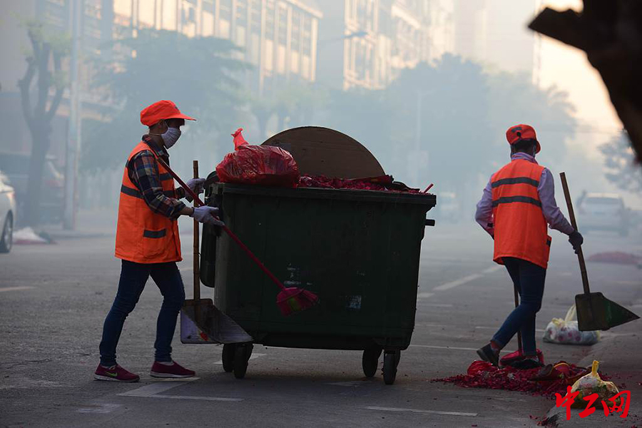 2017年1月28日,海南琼海,环卫工人在晨曦中清扫灰。当天是农历鸡年正月初一,由于夜里家家户户放鞭炮,早已严阵以待的环卫工人天还不亮就全体出动,分赴各自负责的区域清扫炮灰,让人们干干净净欢度节日。(来源:视觉中国)