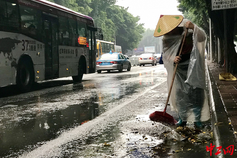 2018年10月10日,早晨,广州白云区京溪路,清洁工人在小雨中工作,当日气温降至19-26摄氏度。(来源:视觉中国)