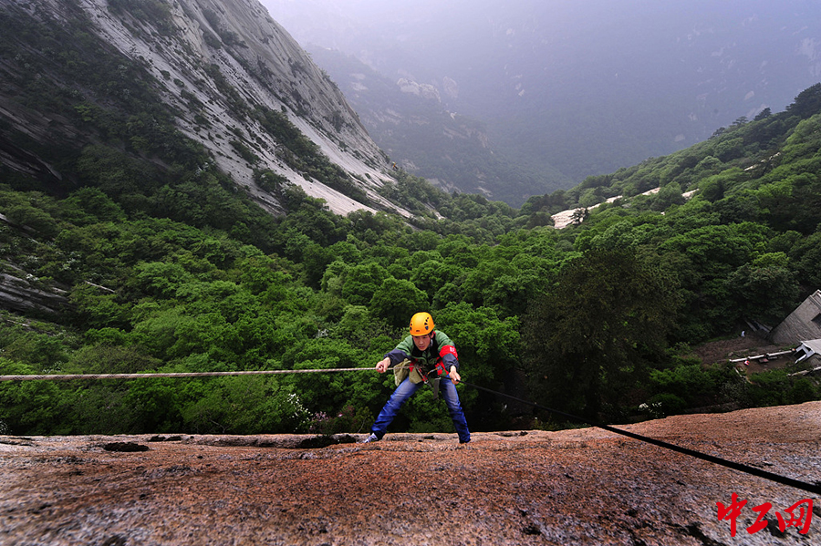 2012年5月10日,陕西华山金锁关,一名环卫工正向悬崖下移动。(来源:视觉中国)