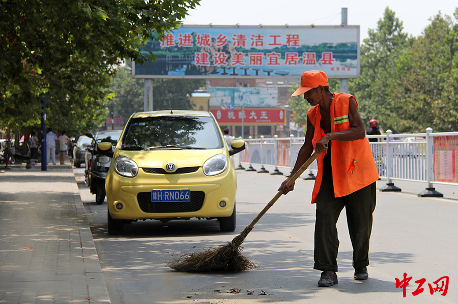 8月5日,一名环卫工在河南省温县街头打扫卫生。当日,该县最高气温达38℃。(来源:视觉中国)