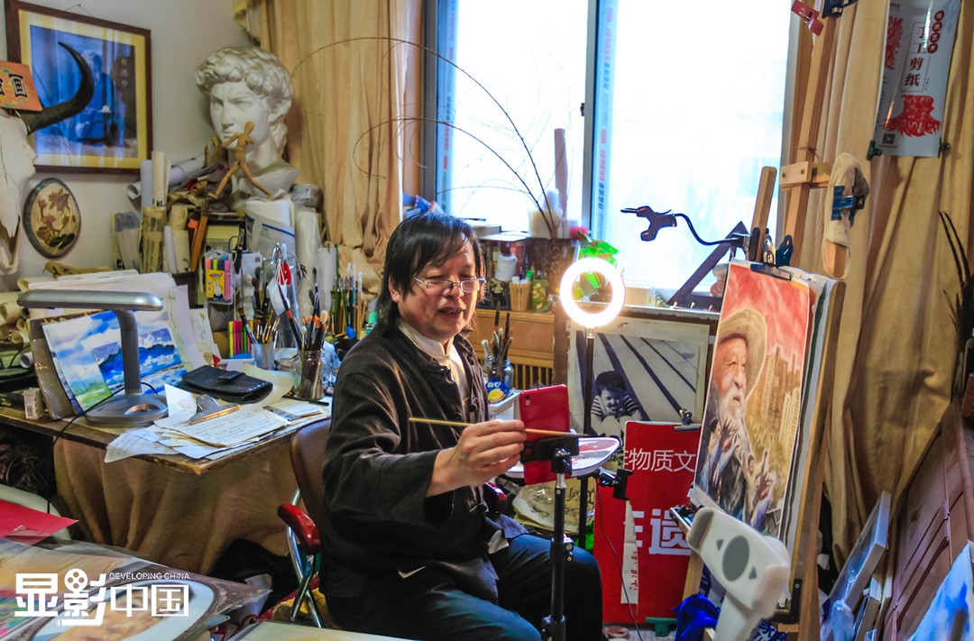 “大家看我的运笔,这个地方得一点一点地涂……”10月21日,在沈阳市铁西区一间不大的房间内,蒋永华正在向学员直播讲解炭精画绘画技巧。图为蒋永华在自己家中直播炭精画绘画技巧。新华网 夏铭阳摄