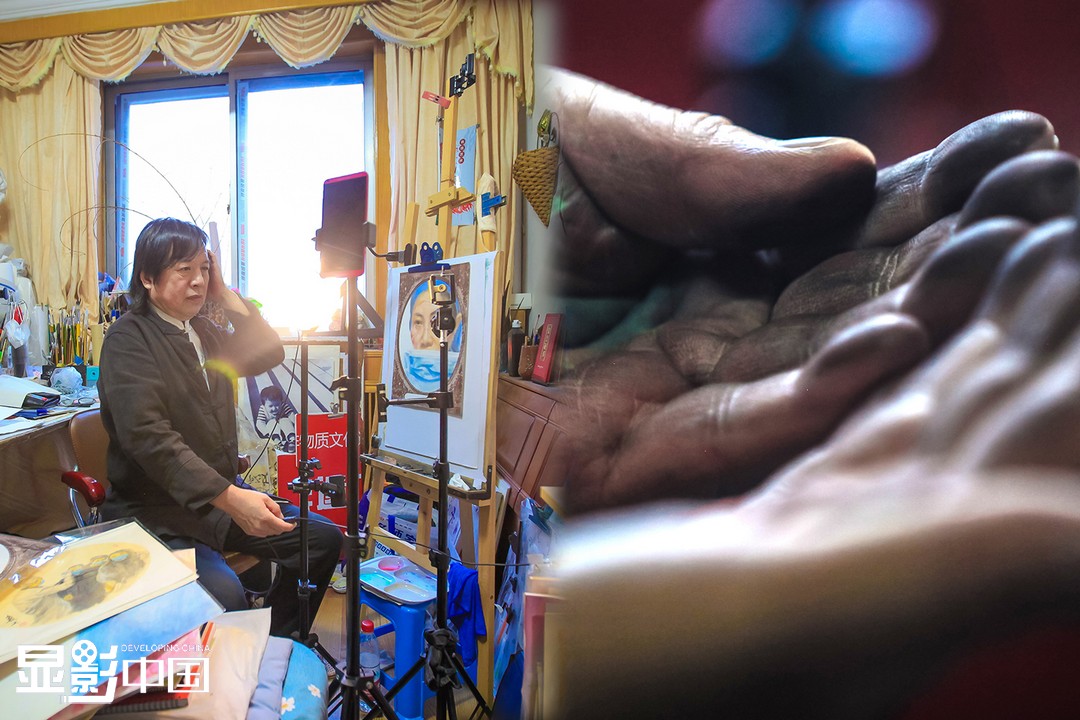 蒋永华自幼跟奶奶学习炭精画,起初他对这门技艺并不感兴趣,甚至有些排斥。“炭精画以炭精粉为主要材料,用棉球,特质的毛笔等工具作画。炭精画作画后往往会很脏,有一次我画完画去亲戚家,长辈们都问我是不是去挖煤了,脸怎么这么黑。”蒋永华说。图为每次画完炭精画,蒋永华的手上就经常布满了难以清除的碳颜料。新华网 夏铭阳摄