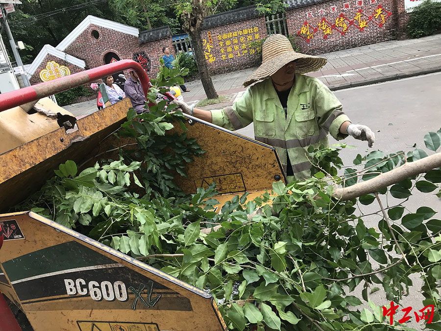 10月27日,海南琼海,园林工人将砍伐下来的树枝切碎后运走。据海南省气象局消息,今年第18号台风“莫拉菲”当日早晨已加强为强台风级,目前位于西沙永兴岛东南方的南海东南部海面上,中心附近最大风力14级。受“莫拉菲”和冷空气共同影响,27日至28日白天,海南省海域有强风雨天气,岛上大部分地区有大到暴雨、局地大暴雨。十月份以来,海南接二连三遭受台风暴雨影响,琼海市园林工人连日加紧修剪街道两旁的树枝,确保风雨期间道路通畅行人安全。(来源:人民视觉)