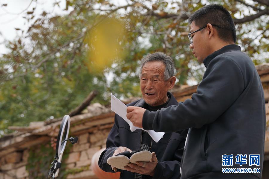 10月28日,李三平(左)和现任村支书段计永商量直播脚本。 新华社记者 牟宇 摄