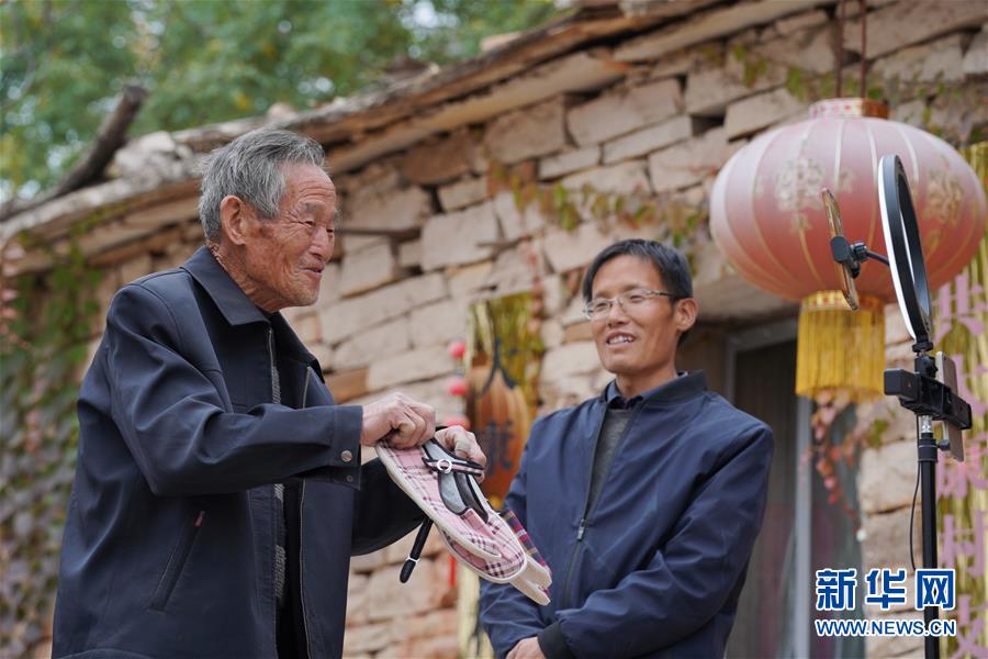 10月28日,李三平(左)在直播中推介村民手工制作的布鞋。 新华社记者 牟宇 摄