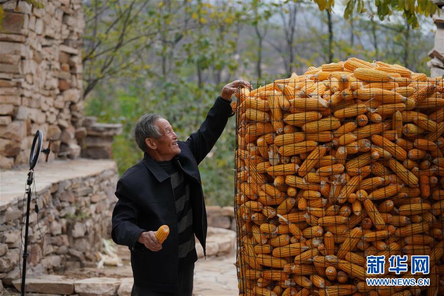10月28日,李三平在直播中介绍村里的玉米。 新华社记者 牟宇 摄