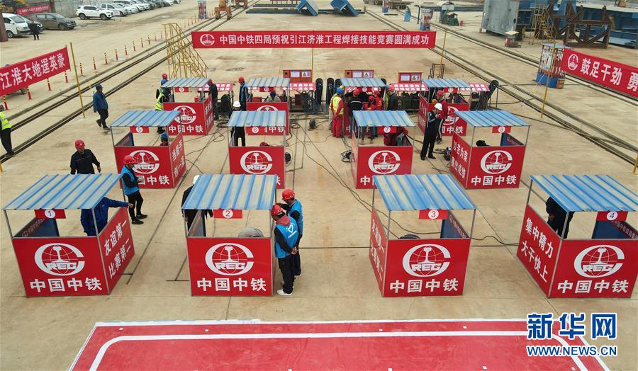 这是10月29日拍摄的焊接技能竞赛现场(无人机照片)。 当日,一场焊接技能竞赛在中国中铁四局承建的引江济淮工程淠河总干渠钢渡槽项目部展开,通过竞赛,参建方焊接技术能手展示技艺、相互学习,共同提升技能水平。 新华社记者 周牧 摄