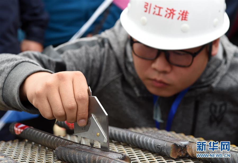 10月29日,在焊接技能竞赛现场,评委对选手现场制作的试件进行外观评审。 当日,一场焊接技能竞赛在中国中铁四局承建的引江济淮工程淠河总干渠钢渡槽项目部展开,通过竞赛,参建方焊接技术能手展示技艺、相互学习,共同提升技能水平。 新华社记者 周牧 摄