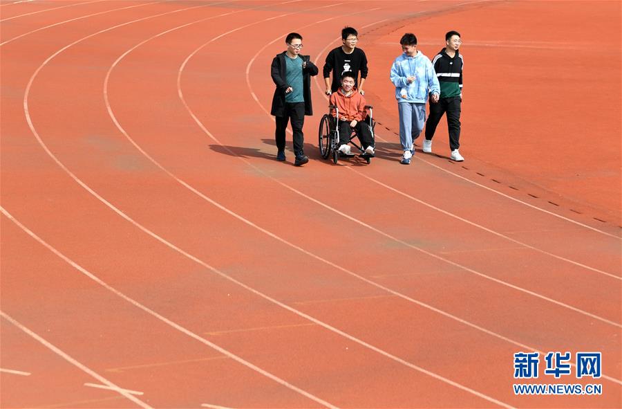 在巢湖学院,爱心帮扶小组成员推着程东东在操场上散步(10月19日摄)。 教室总在一楼,座位总是第一排,出门总有同学帮忙,轮椅后总有双温暖的手——从小学到高中,程东东身边始终有一群同学守护着他,传递着爱的“接力棒”。 2020年,程东东被巢湖学院录取,成为一名大学生。这场爱心接力在大学校园延续。 程东东2001年出生于安徽省广德市邱村镇,2008年被确诊为进行性肌营养不良症,逐渐失去行动能力,成为“渐冻人”。从2010年开始的10年间,由同学成立的三届帮扶小组用点点滴滴的爱心陪伴着程东东成长。 9月底,程东东开启了大学生活。在报到那天,巢湖学院安排车辆把程东东从广德接到了学校,并为程东东和母亲提供一间位于一楼的爱心宿舍。很快,程东东所在的班级成立“爱心帮扶小组”,40多名男生成为帮扶小组的成员,轮流陪伴、帮扶程东东。 如今,圆梦大学的程东东在新同学、新老师的关爱下,过着属于他的大学生活,轮椅上的他依然阳光自信。 “希望未来能用自己的力量去回报社会,创造更美好的生活!”程东东说。 新华社记者 张端 摄
