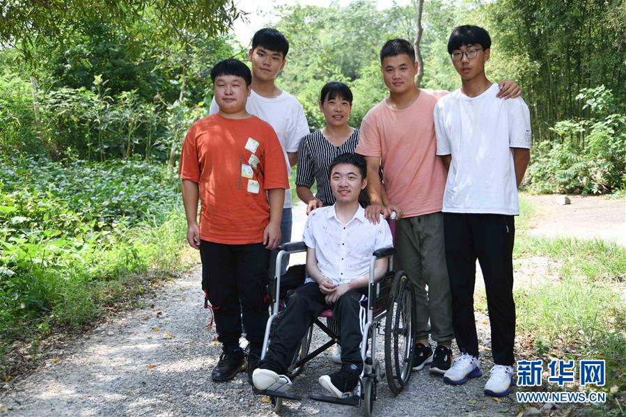 暑假期间,程东东和前来看望自己的广德中学爱心帮扶小组部分成员一起合影(8月26日摄)。 教室总在一楼,座位总是第一排,出门总有同学帮忙,轮椅后总有双温暖的手——从小学到高中,程东东身边始终有一群同学守护着他,传递着爱的“接力棒”。 2020年,程东东被巢湖学院录取,成为一名大学生。这场爱心接力在大学校园延续。 程东东2001年出生于安徽省广德市邱村镇,2008年被确诊为进行性肌营养不良症,逐渐失去行动能力,成为“渐冻人”。从2010年开始的10年间,由同学成立的三届帮扶小组用点点滴滴的爱心陪伴着程东东成长。 9月底,程东东开启了大学生活。在报到那天,巢湖学院安排车辆把程东东从广德接到了学校,并为程东东和母亲提供一间位于一楼的爱心宿舍。很快,程东东所在的班级成立“爱心帮扶小组”,40多名男生成为帮扶小组的成员,轮流陪伴、帮扶程东东。 如今,圆梦大学的程东东在新同学、新老师的关爱下,过着属于他的大学生活,轮椅上的他依然阳光自信。 “希望未来能用自己的力量去回报社会,创造更美好的生活!”程东东说。 新华社记者 张端 摄
