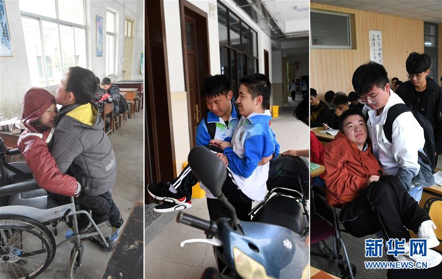 这是一张拼版照片,左图为:在广德市邱村镇中心小学,爱心帮扶小组的同学将程东东抱上轮椅(2012年3月3日摄,新华社发);中图为:在广德中学,爱心帮扶小组成员雷啸抱着程东东回教室(2020年5月28日,新华社记者刘军喜摄);右图为:在巢湖学院,爱心帮扶小组成员抱着程东东来到教室(10月19日,新华社记者刘军喜摄)。 教室总在一楼,座位总是第一排,出门总有同学帮忙,轮椅后总有双温暖的手——从小学到高中,程东东身边始终有一群同学守护着他,传递着爱的“接力棒”。 2020年,程东东被巢湖学院录取,成为一名大学生。这场爱心接力在大学校园延续。 程东东2001年出生于安徽省广德市邱村镇,2008年被确诊为进行性肌营养不良症,逐渐失去行动能力,成为“渐冻人”。从2010年开始的10年间,由同学成立的三届帮扶小组用点点滴滴的爱心陪伴着程东东成长。 9月底,程东东开启了大学生活。在报到那天,巢湖学院安排车辆把程东东从广德接到了学校,并为程东东和母亲提供一间位于一楼的爱心宿舍。很快,程东东所在的班级成立“爱心帮扶小组”,40多名男生成为帮扶小组的成员,轮流陪伴、帮扶程东东。 如今,圆梦大学的程东东在新同学、新老师的关爱下,过着属于他的大学生活,轮椅上的他依然阳光自信。 “希望未来能用自己的力量去回报社会,创造更美好的生活!”程东东说。 新华社发