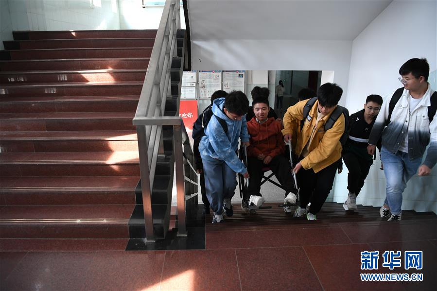 在巢湖学院,爱心帮扶小组成员抬着程东东上楼梯(10月19日摄)。 教室总在一楼,座位总是第一排,出门总有同学帮忙,轮椅后总有双温暖的手——从小学到高中,程东东身边始终有一群同学守护着他,传递着爱的“接力棒”。 2020年,程东东被巢湖学院录取,成为一名大学生。这场爱心接力在大学校园延续。 程东东2001年出生于安徽省广德市邱村镇,2008年被确诊为进行性肌营养不良症,逐渐失去行动能力,成为“渐冻人”。从2010年开始的10年间,由同学成立的三届帮扶小组用点点滴滴的爱心陪伴着程东东成长。 9月底,程东东开启了大学生活。在报到那天,巢湖学院安排车辆把程东东从广德接到了学校,并为程东东和母亲提供一间位于一楼的爱心宿舍。很快,程东东所在的班级成立“爱心帮扶小组”,40多名男生成为帮扶小组的成员,轮流陪伴、帮扶程东东。 如今,圆梦大学的程东东在新同学、新老师的关爱下,过着属于他的大学生活,轮椅上的他依然阳光自信。 “希望未来能用自己的力量去回报社会,创造更美好的生活!”程东东说。 新华社记者 刘军喜 摄