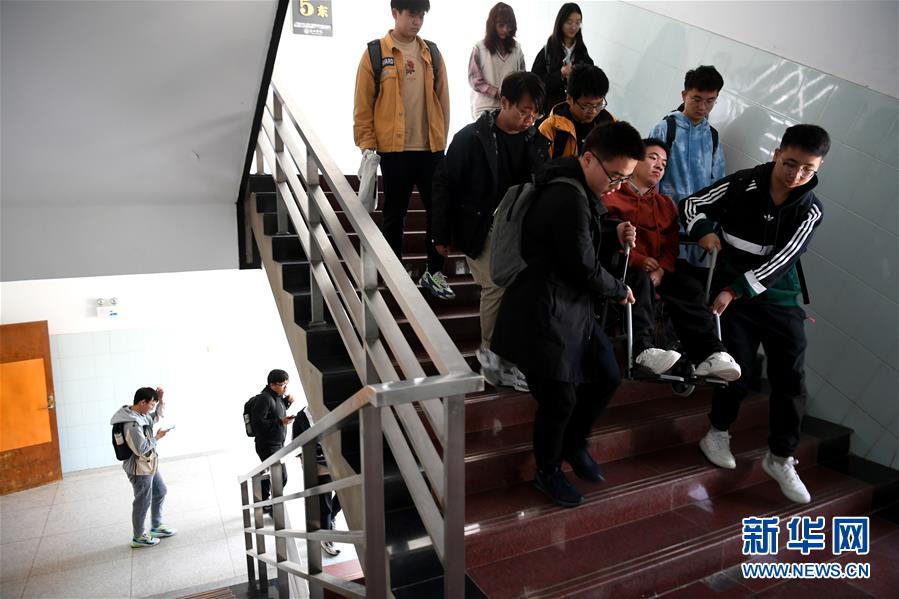 在巢湖学院,爱心帮扶小组成员抬着程东东下楼梯(10月19日摄)。 教室总在一楼,座位总是第一排,出门总有同学帮忙,轮椅后总有双温暖的手——从小学到高中,程东东身边始终有一群同学守护着他,传递着爱的“接力棒”。 2020年,程东东被巢湖学院录取,成为一名大学生。这场爱心接力在大学校园延续。 程东东2001年出生于安徽省广德市邱村镇,2008年被确诊为进行性肌营养不良症,逐渐失去行动能力,成为“渐冻人”。从2010年开始的10年间,由同学成立的三届帮扶小组用点点滴滴的爱心陪伴着程东东成长。 9月底,程东东开启了大学生活。在报到那天,巢湖学院安排车辆把程东东从广德接到了学校,并为程东东和母亲提供一间位于一楼的爱心宿舍。很快,程东东所在的班级成立“爱心帮扶小组”,40多名男生成为帮扶小组的成员,轮流陪伴、帮扶程东东。 如今,圆梦大学的程东东在新同学、新老师的关爱下,过着属于他的大学生活,轮椅上的他依然阳光自信。 “希望未来能用自己的力量去回报社会,创造更美好的生活!”程东东说。 新华社记者 刘军喜 摄