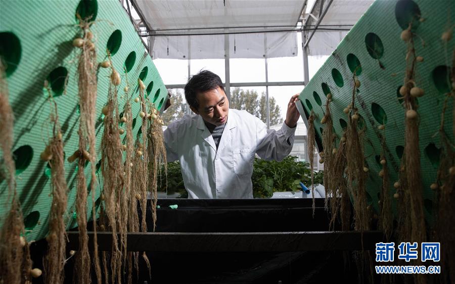 在布拖马铃薯科技小院,四川农业大学农学院博士研究生严奉君在查看雾培马铃薯原原种(10月18日摄)。