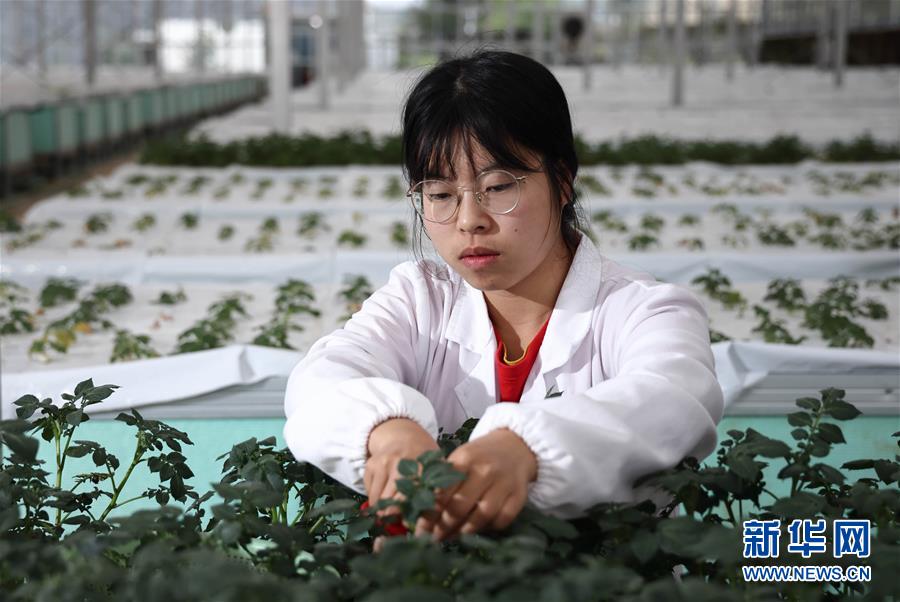 在布拖马铃薯科技小院,四川农业大学农学院硕士研究生徐驰在切割马铃薯芯苗准备扦插定植(10月18日摄)。新华社记者 江宏景 摄