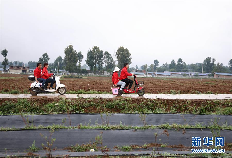 四川农业大学农学院研究生冯豪杰(右一)、徐驰(右二)、朱嘉心(右三)和严奉君,拿着农具和马铃薯种薯骑行前往布拖县布江蜀丰农业科技示范园的试验田(10月18日摄)。 新华社记者 江宏景 摄