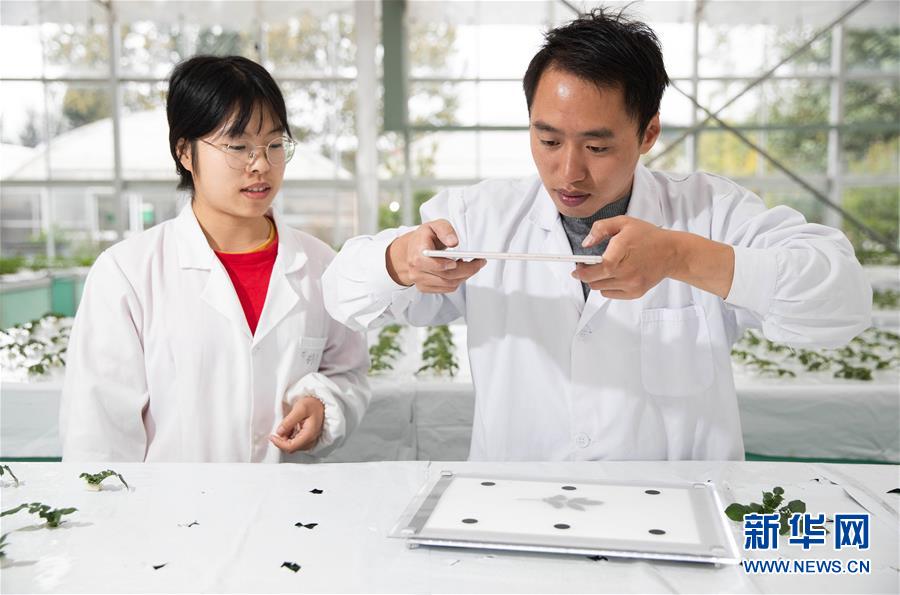 在布拖马铃薯科技小院,四川农业大学农学院硕士研究生徐驰、博士研究生严奉君在测量马铃薯光合面积及虫斑(10月18日摄)。 新华社记者 江宏景 摄