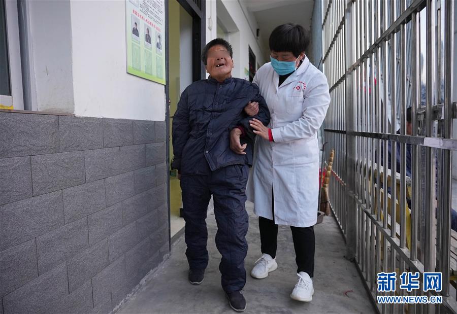 11月3日,在陕西省延安市黄陵县残疾人托养康复中心,医护人员扶着一名残疾人出门散步。 新华社记者 才扬 摄