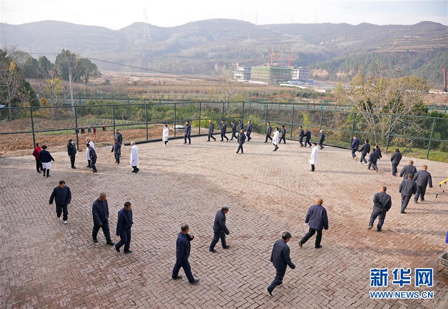 11月3日,在陕西省延安市黄陵县残疾人托养康复中心,医护人员带领残疾人散步。 新华社记者 才扬 摄