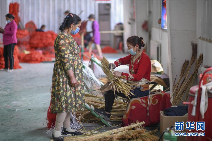 在墨玉县阿克萨拉依乡乌尊艾日克村佳美扫把制作中心,当地村民在制作扫把(5月23日摄)。 新华社记者 赵戈 摄
