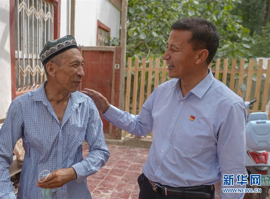 在墨玉县阿克萨拉依乡乌尊艾日克村,吾肉孜阿力·哈西哈尔巴依(右)与村民米热西木·尼扎米丁交谈(5月23日摄)。 新华社记者 赵戈 摄