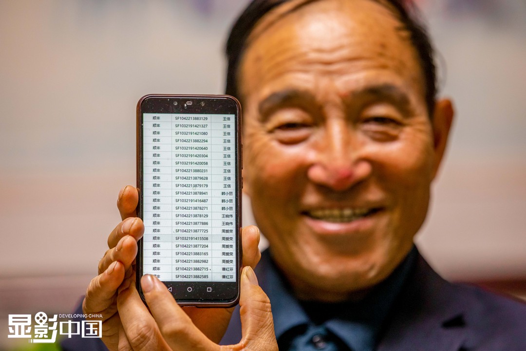 每当有果商到临猗,王万保都把家里最好的房间和被褥让给果商住。在真诚接待的同时,王万保还提供选果、包果、装箱、结算、发车“一站式”服务。凭着务实、诚信的待客之道,王万保打开了销路。图为王万保展示当天的苹果快递单号。新华网发 王浩庆/文 金玉敏/摄