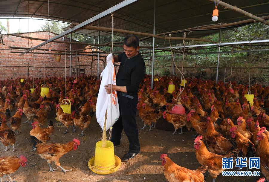 11月6日,张荣和在给鸡喂食。新华社记者 王全超 摄