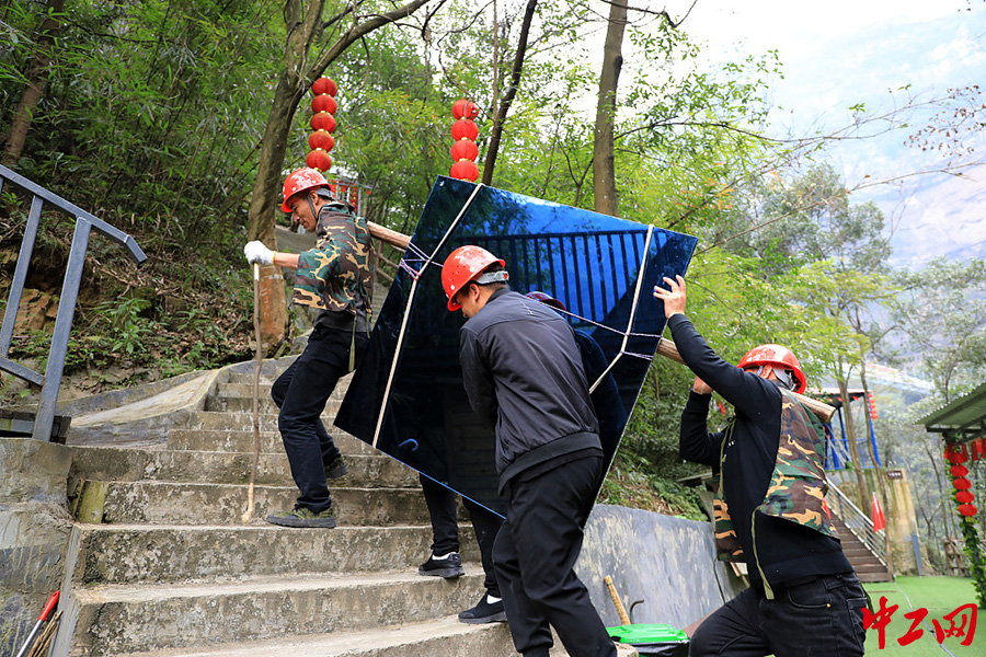 11月5日,湖北宜昌市,蔡桂林和工友们一起扛着160斤左右的玻璃在山路上转弯。(来源:视觉中国)