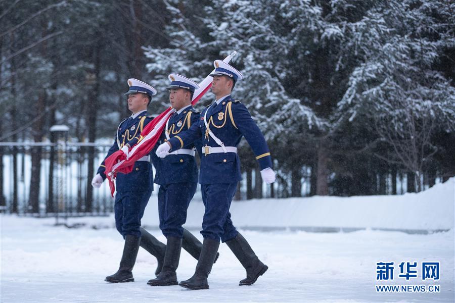 11月7日,在漠河市北极村消防救援站,消防员举行升旗仪式。新华社发(张涛 摄)