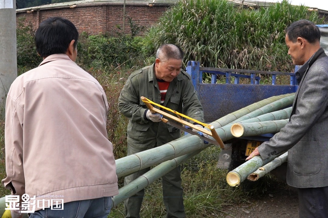 图为李年根正和村民一同将竹子原料装车运输。新华网发 郭志杰摄