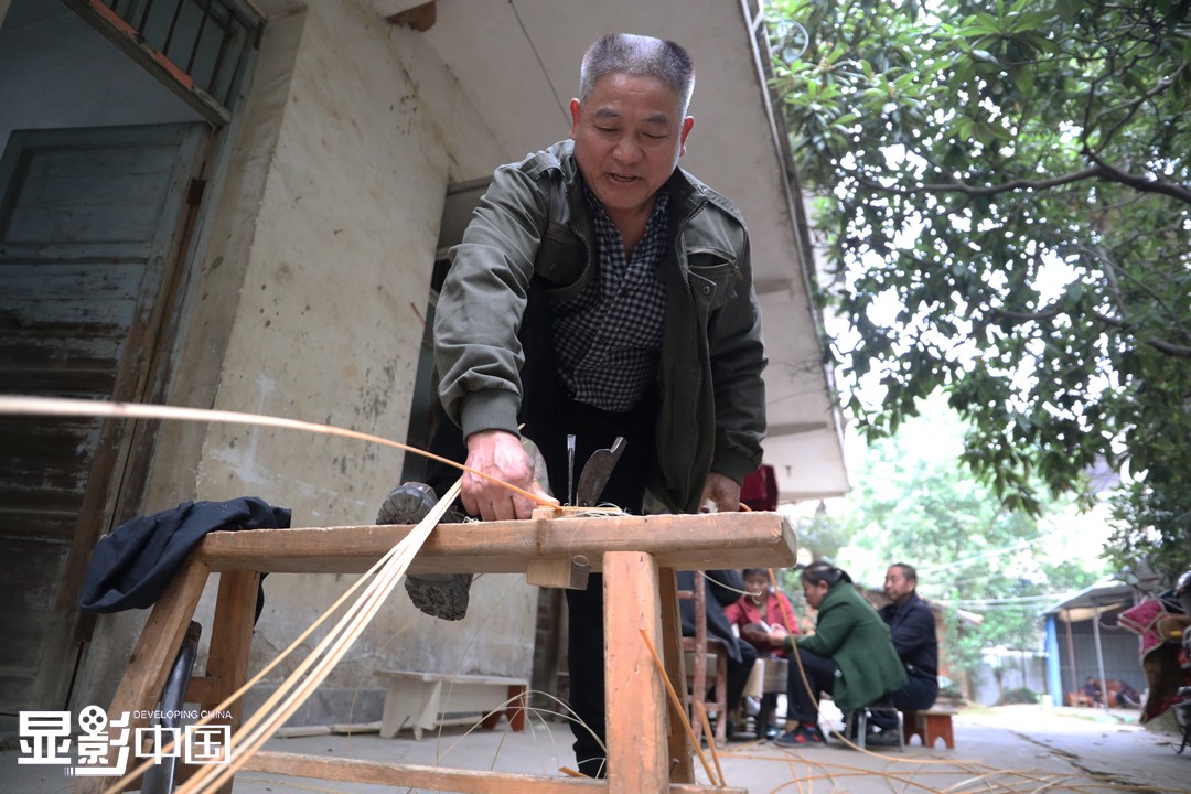 在李年根看来,竹编不仅是一门手艺,更是生活的一部分。图为李年根正在工作室门前对竹编原材料进行加工。新华网 王凯丰摄