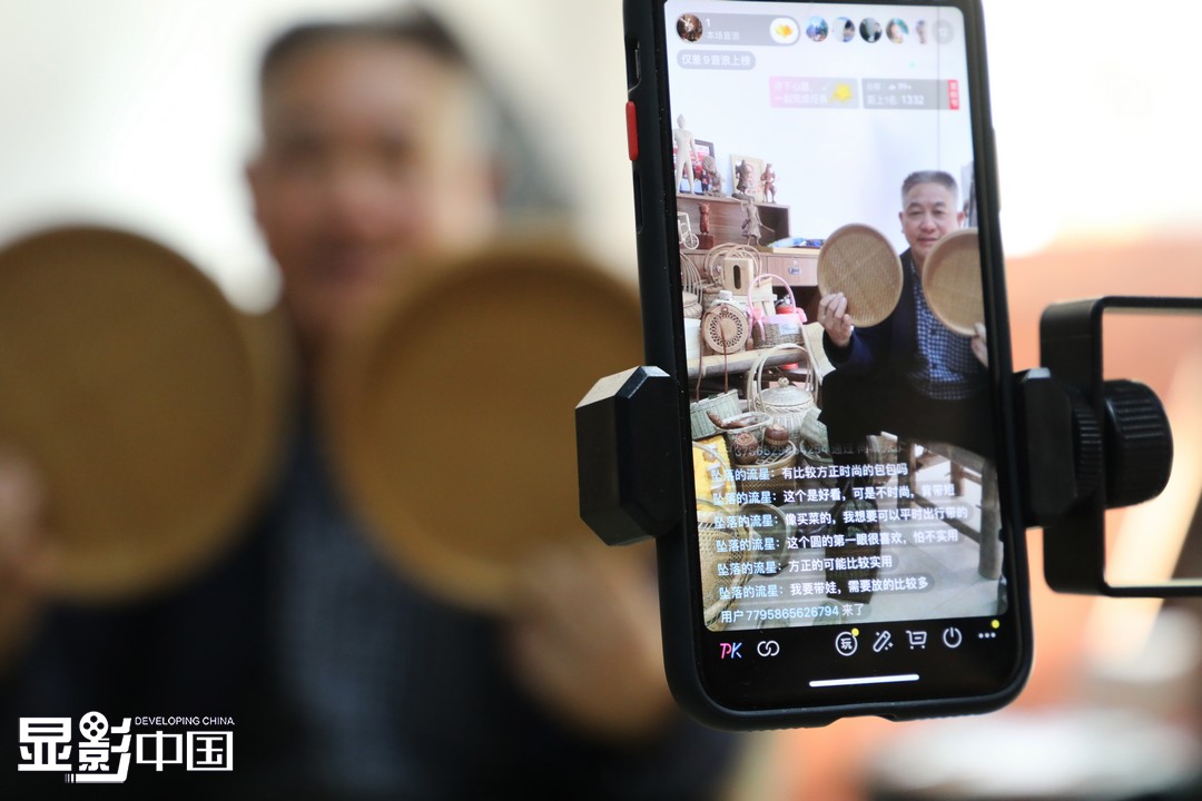 “好的东西只要认真去做,总有一天可以被看到。”如今通过电商渠道,李年根竹编制品的销售额每个月能达到数万元,这让他高兴得“睡不着觉”。图为李年根正在直播间内进行带货直播。新华网 王凯丰摄