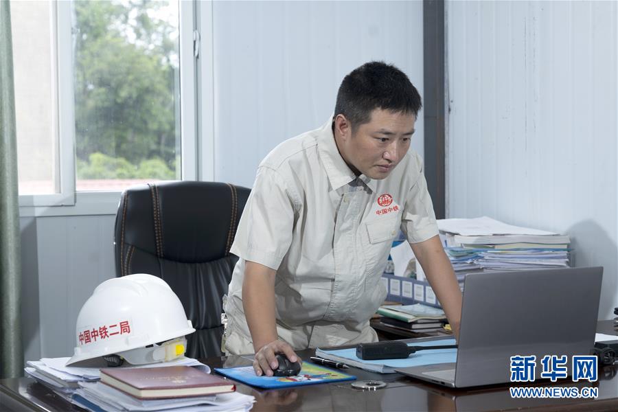 在老挝首都万象北郊的中老铁路项目部办公室,徐州查看工作资料(8月5日摄)。新华社发(潘龙柱摄)