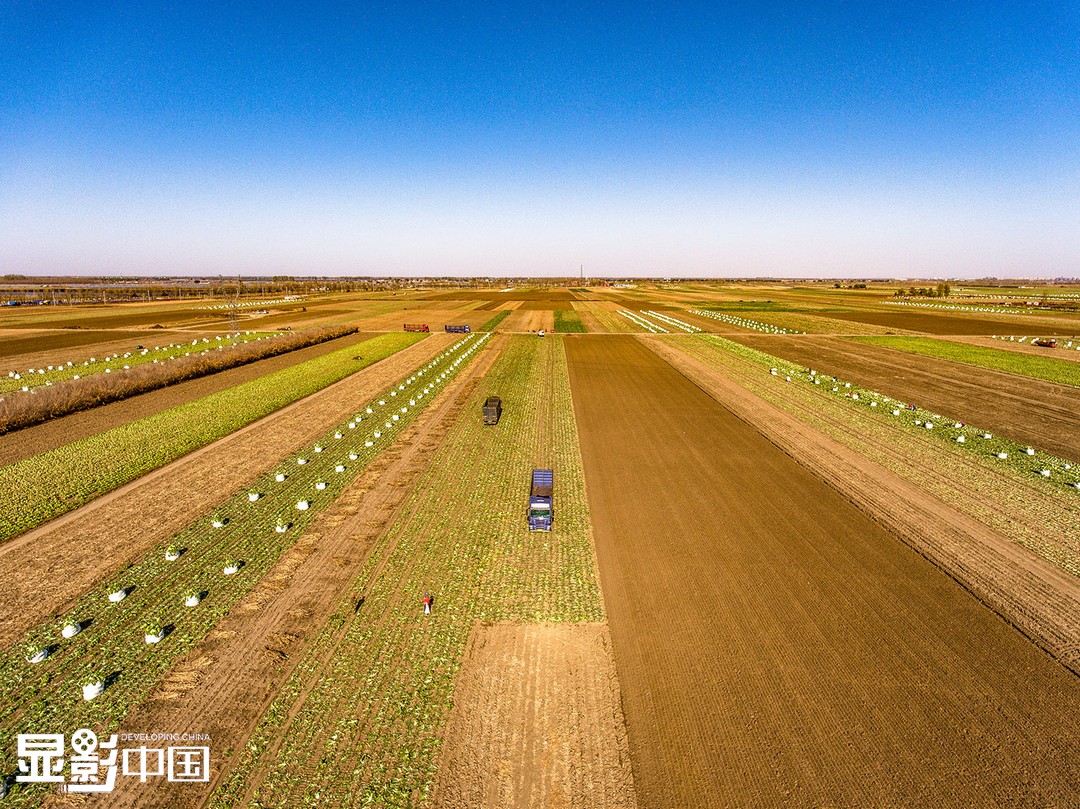 11月初,辽宁省新民市大民屯镇,冬意初显,气温接近0℃。对于当地的村民来说,这是一年中最紧张而忙碌的时刻。图为新民市大民屯镇内,收割好的白菜装袋后摆在田间。新华网 夏铭阳摄